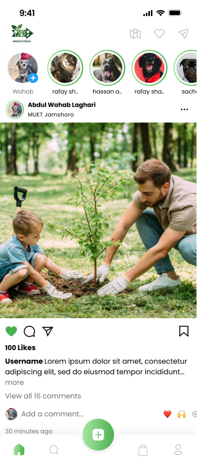 A mobile application UI design for Green Streak, an eco-friendly app with gamification elements to encourage sustainable practices.